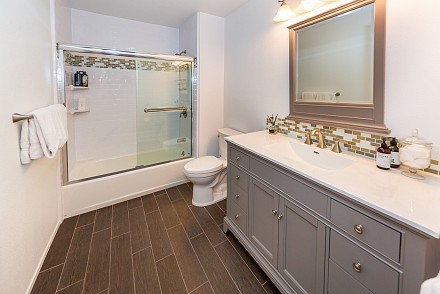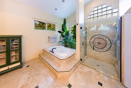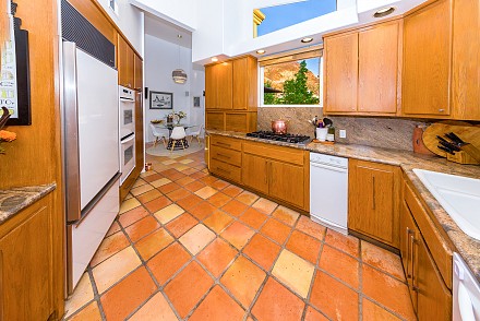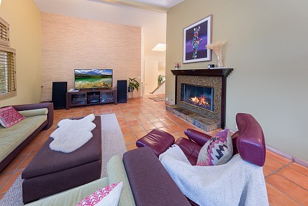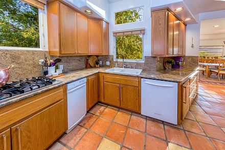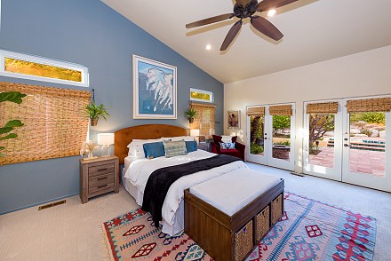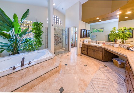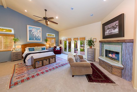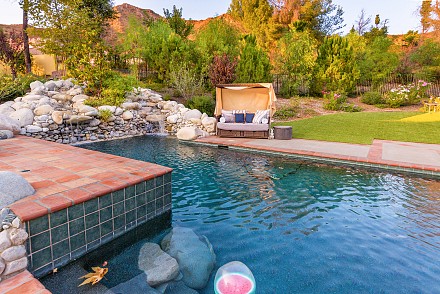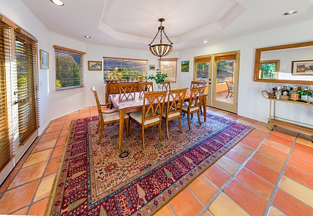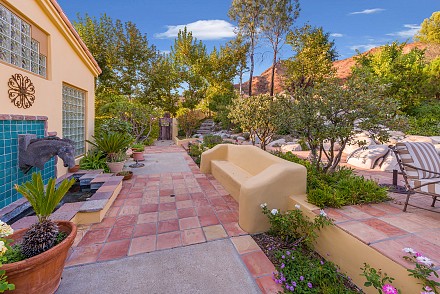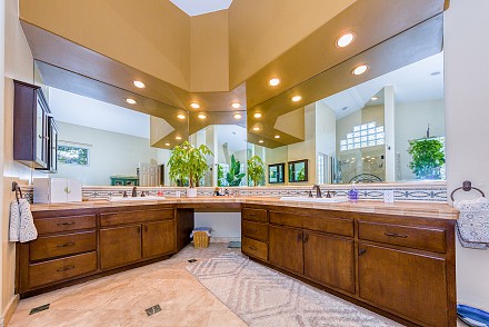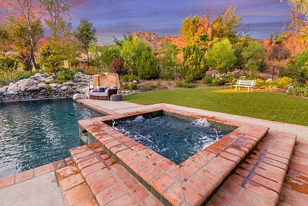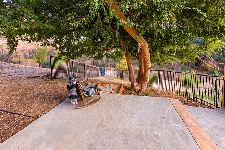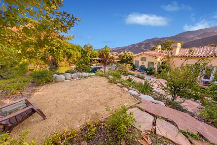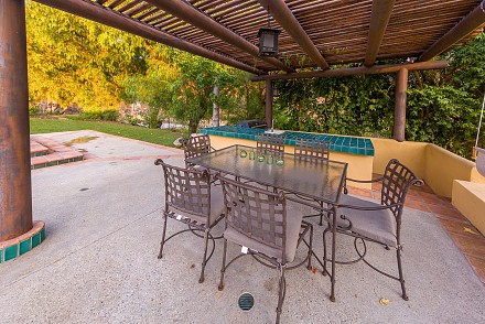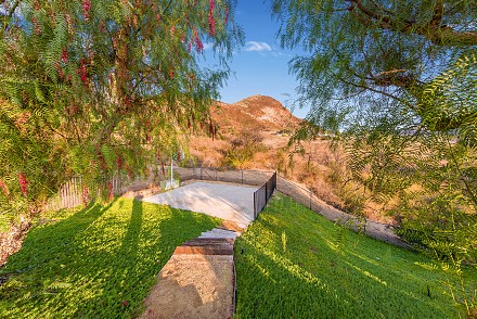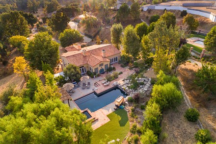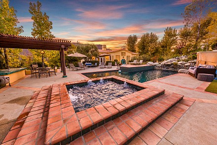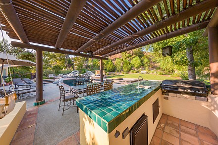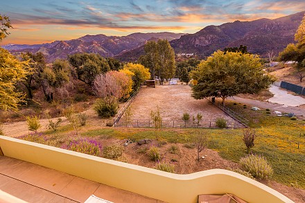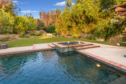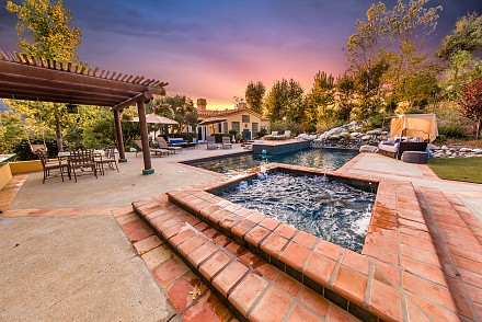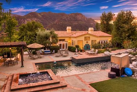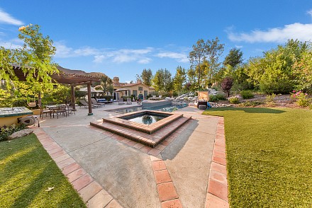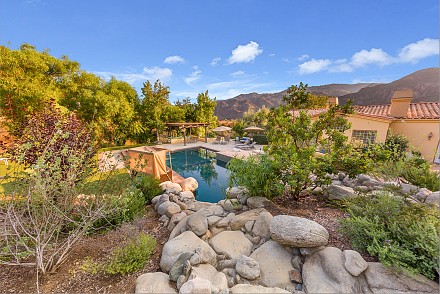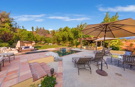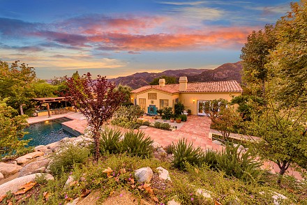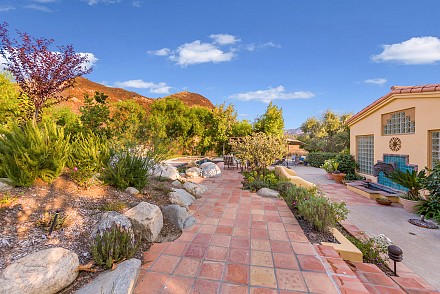 On this magnificent property, the hills are alive, with colors, sights, & sounds, to tantalize the senses. Meandering along the 1.42 acre pathways fragrances of flowers cascade over boulders. Rounding the corner of the fenced-in horse arena, the sounds of the waterfall spilling into the pool/spa, with its adjoining outdoor kitchen & pergola-covered dining area, makes it obvious that this is no ordinary home, especially when lounging in one of the patios or shooting hoops in the sports court.