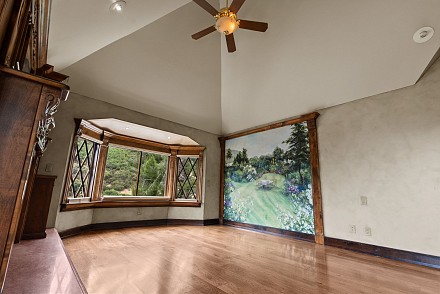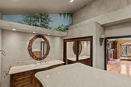 Nestled in a private, serene setting where mountain breezes meet timeless craftsmanship, this nearly 4,000 sq ft custom-built home offers an extraordinary blend of warmth, tradition, and refined elegance. Featuring rich real wood flooring throughout and handcrafted custom wood cabinetry, the home is filled with soul and story, including hand-painted murals inspired by a family farm in Norway that grace the walls with artistry and heart. With 4 bedrooms and 3.5 bathrooms, the spacious layout is designed for both luxurious comfort and everyday functionality. The primary suite is a true retreat, boasting soaring ceilings, stunning mountain views, four closets, including a center island wardrobe station and a spa-inspired bathroom with marble countertops, soaking tub, and a steam shower. The lowest level offers a private suite with separate entrance, bedroom, bathroom, living space, and laundry, ideal for guests, multigenerational living, or a private office. Large secondary bedrooms include one with a private balcony and another with access to a shared, well-appointed bath.