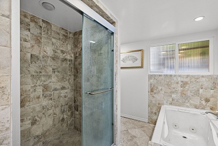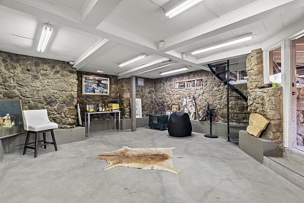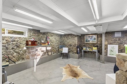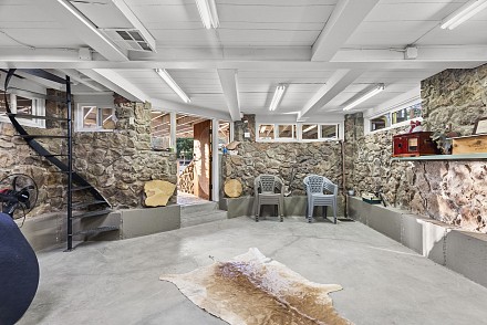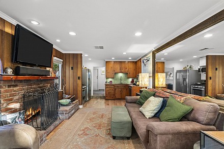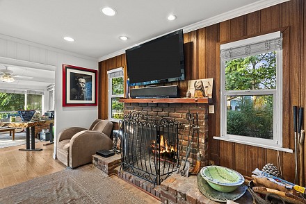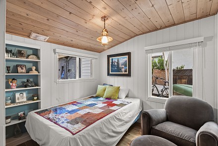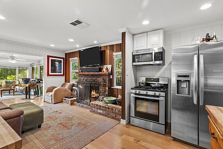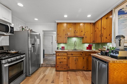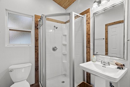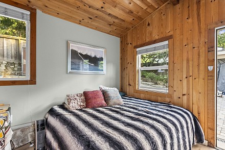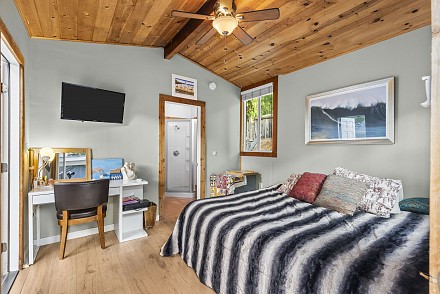 Inside, the main home boasts warm Hickory and Oak flooring, a masonry wood-burning fireplace for cozy evenings, and a character-rich kitchen with tile and Cherry wood butcher block counters. The lakefront primary suite features Jacuzzi brand spa tub and French doors that open onto large Iron wood deck. The living area opens to the same deck. The guest suite is equally inviting with wide plank French Oak floors, private bath and 9'-foot plus knotty pine ceilings. A functional basement w/ 8'-foot ceilings add bonus space not included in the official square footage.